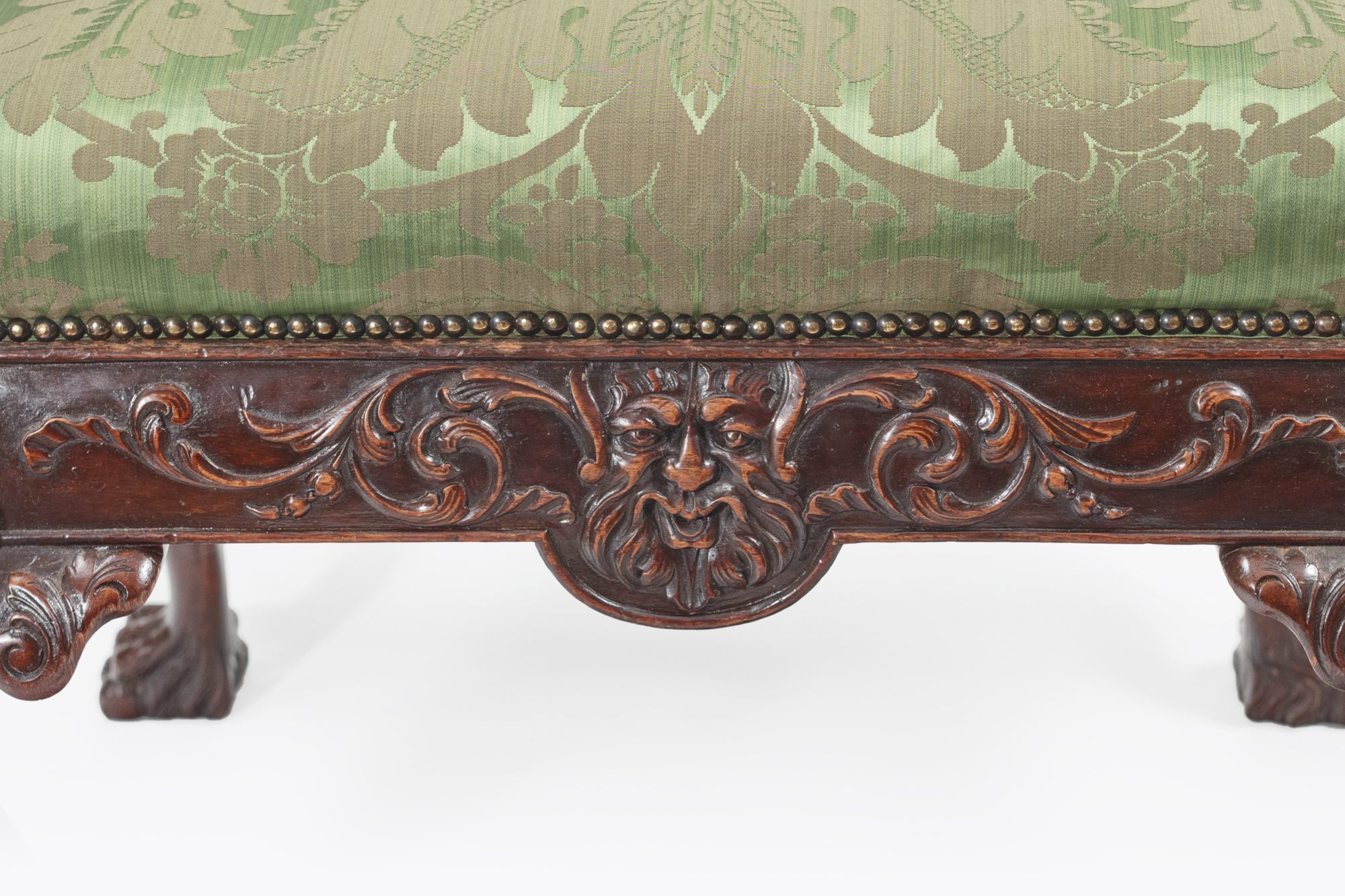18th Century George II Irish mahogany stool of rectangular form, the stuff over upholstered and studded seat raised over ornately carved apron with centred grotesque masque flanked with scrolling acanthus leaf motif to the front and back and centred scallop shell flanked with scrolling acanthus leaf motif on opposing sides supported on four monopodia cabriole legs with lion head masque carved in high relief terminating on hairy paw foot.