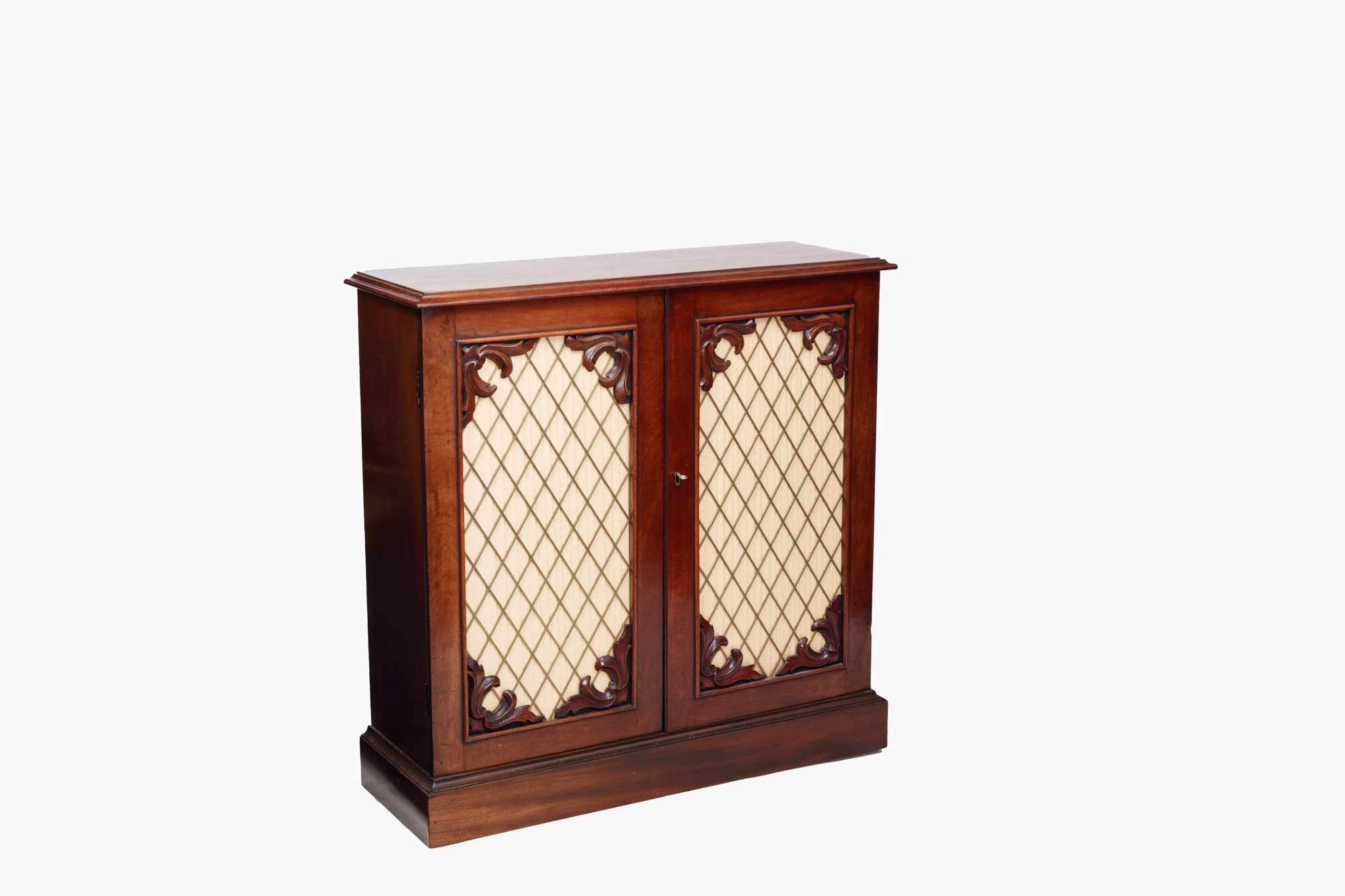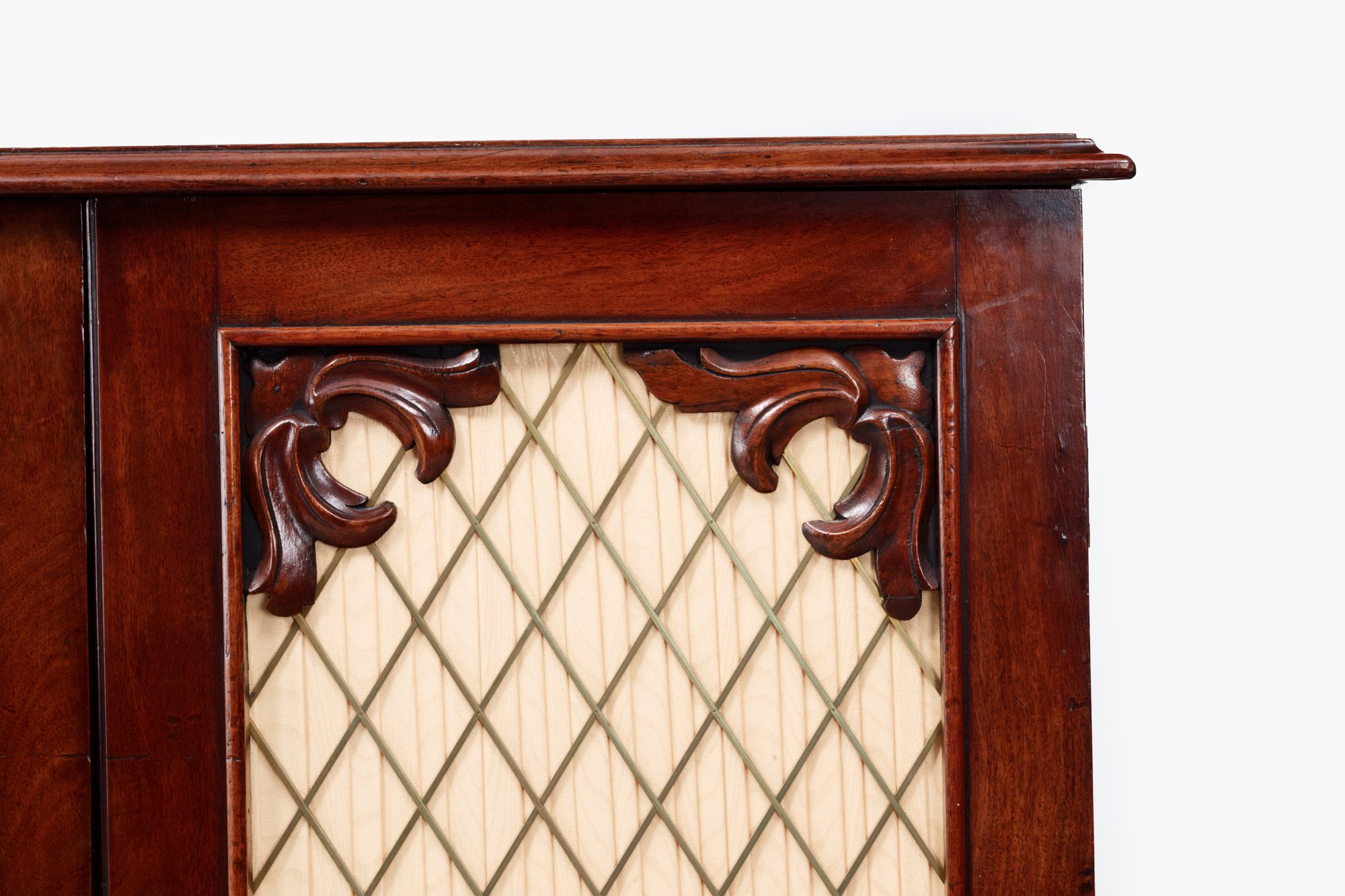 19th Century Regency pair of mahogany cabinets with brass grilled and lined doors featuring ornate carved acanthus leaf details to corners. Fitted with shelves to interior.