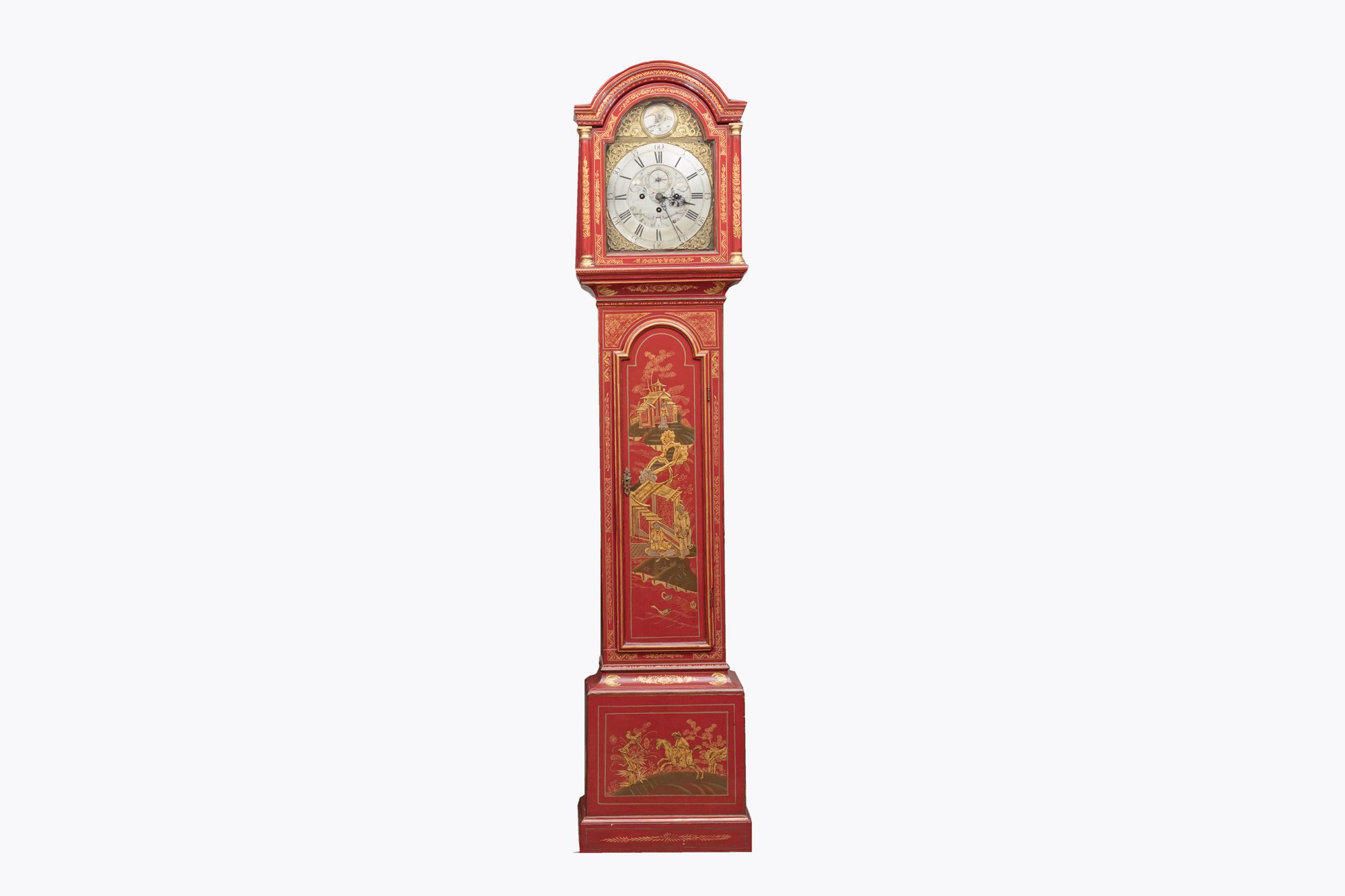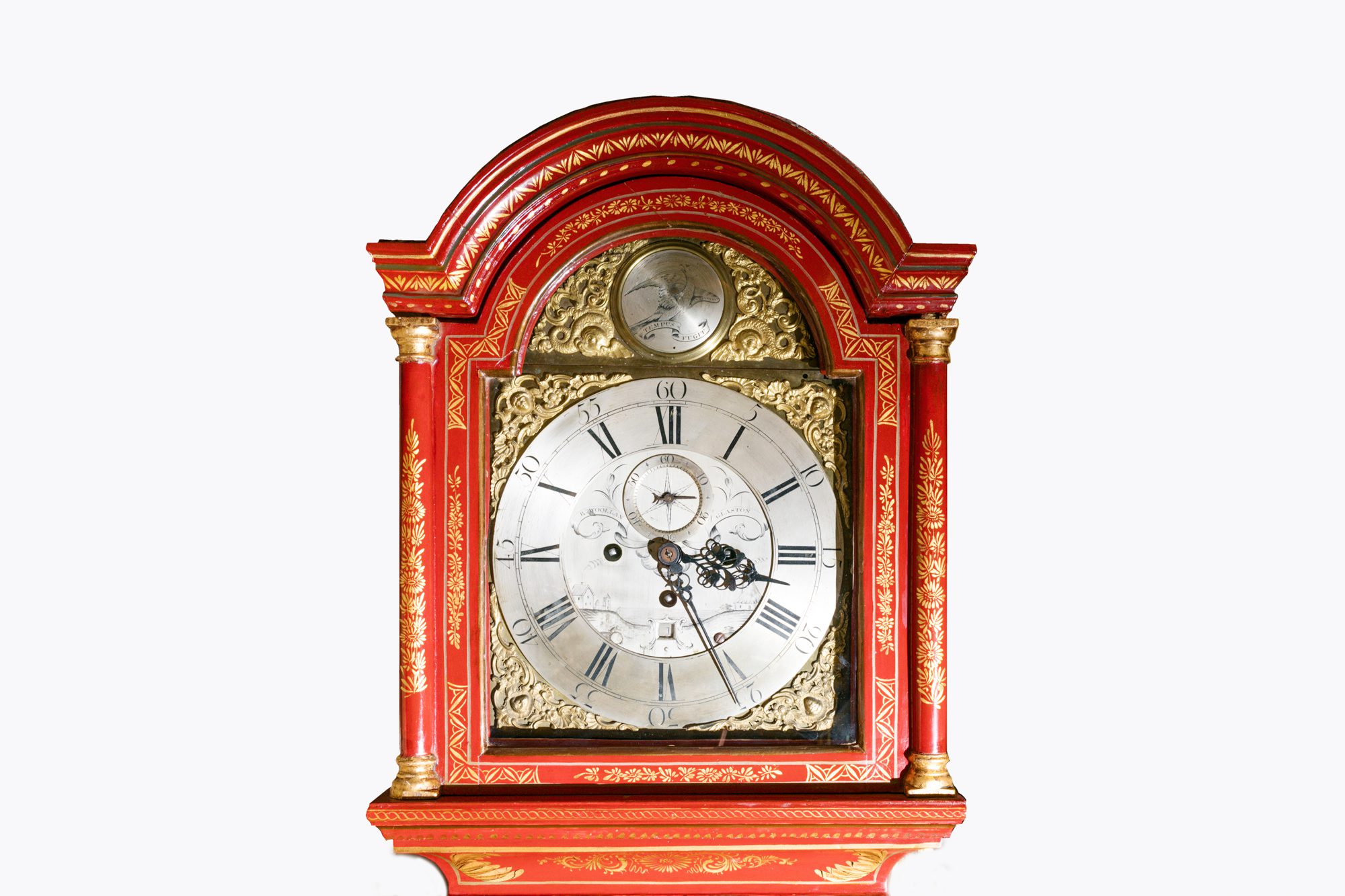 Early 19th Century English Japanned grandfather clock by Robert Woollan of Glastonbury, with an engraved silver and brass face and silver chapter ring. Boasting an intricate hand painted Japanned case with gilt Chinoiserie pagoda, figural and trailing floral designs.
