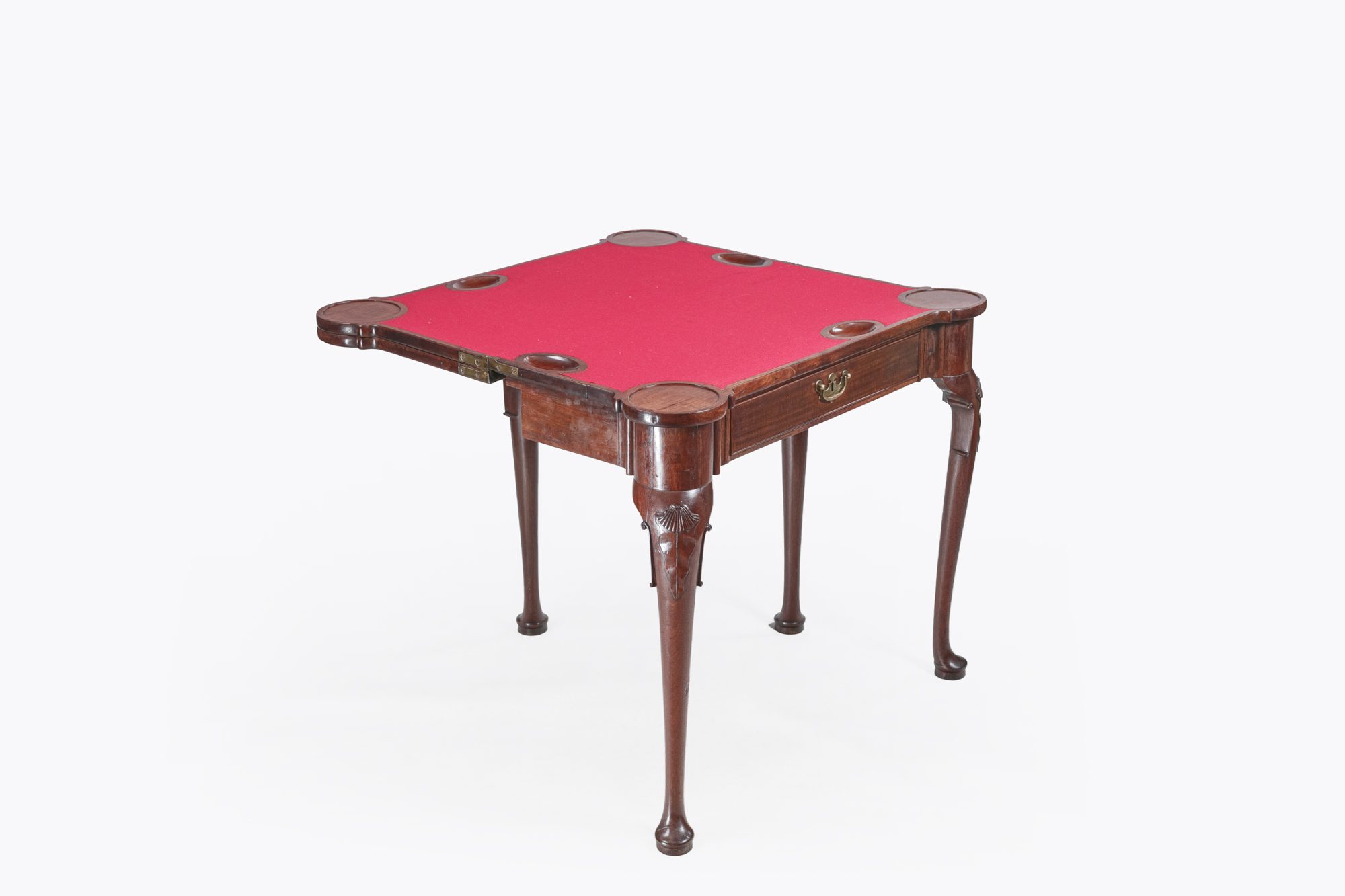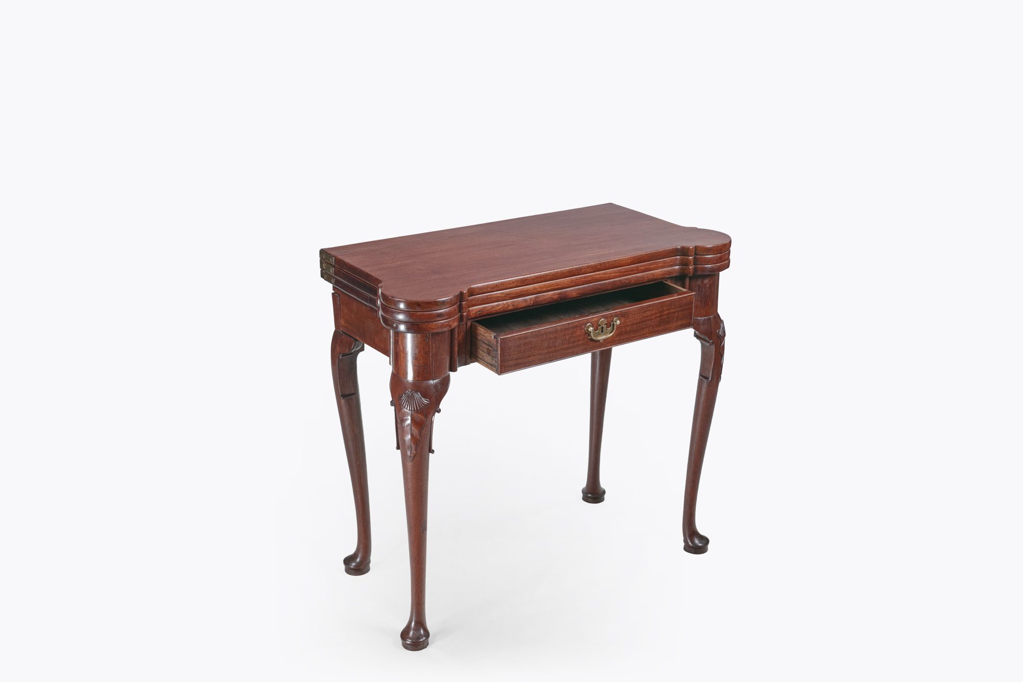 Late 18th Century mahogany triple top fold over card table which opens to reveal a playing surface. It features surfaces for both a game table with baize lining and sunken counter wells, as well as a tea table of the finest quality, to top. It stands on four cabriole legs featuring shell carved knees on the front two and terminating in well-formed pad feet, with a back leg functioning as a gate leg. The drawer is adorned with a brass handle and escutcheon.