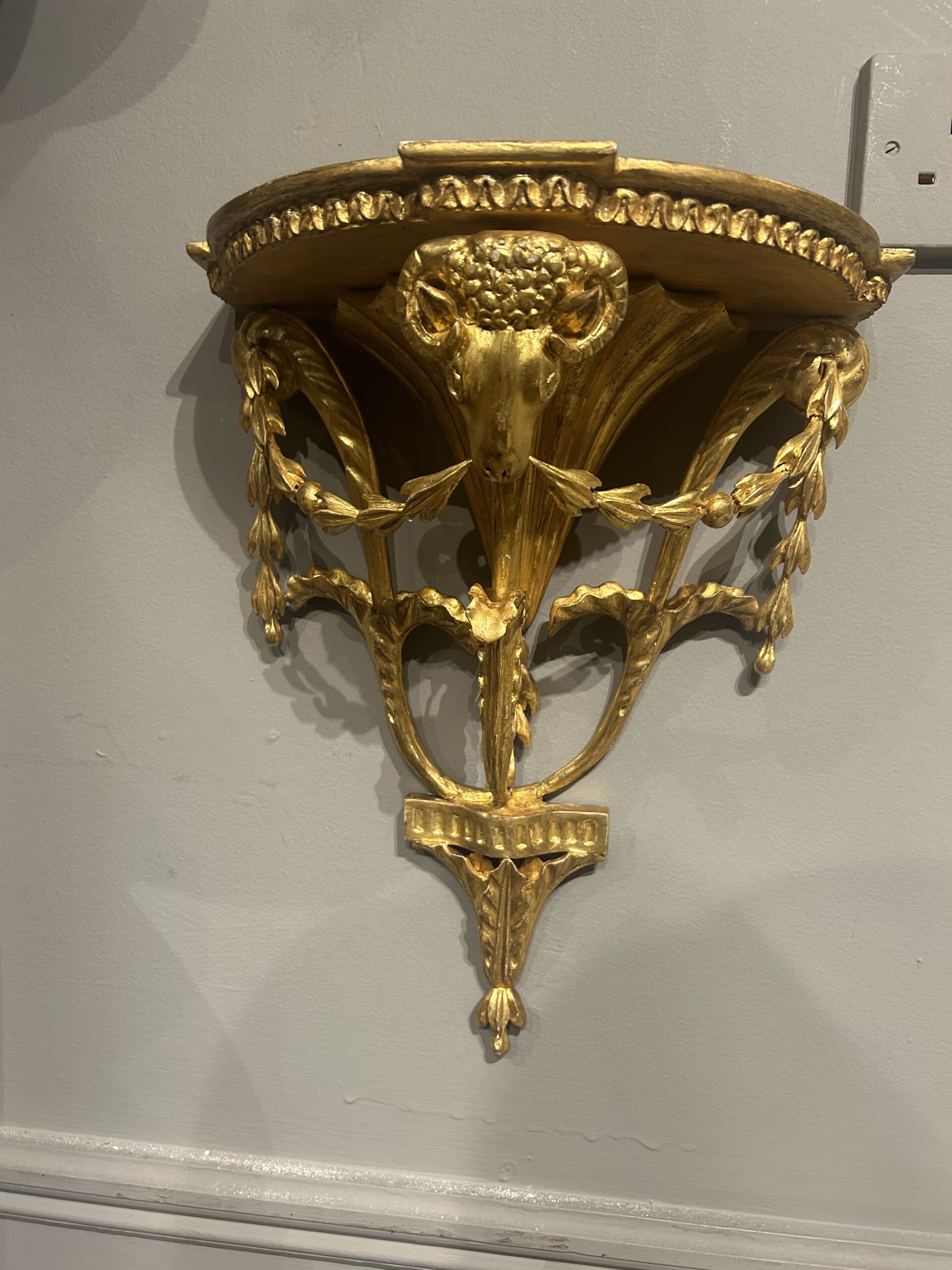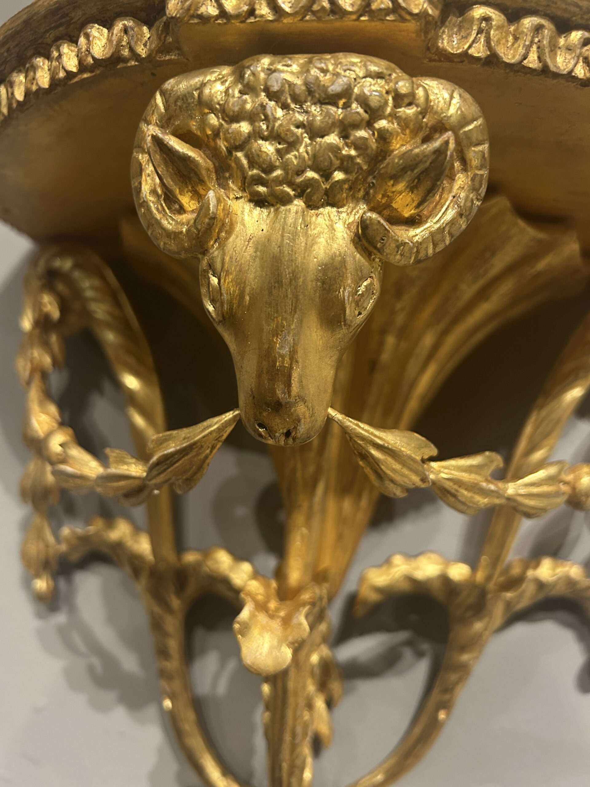 18th Century pair of Adams giltwood wall brackets in the neoclassical style, the shaped and moulded shelf raised over carved ram head, and swags on acanthus leaf and tapering fluted supports.