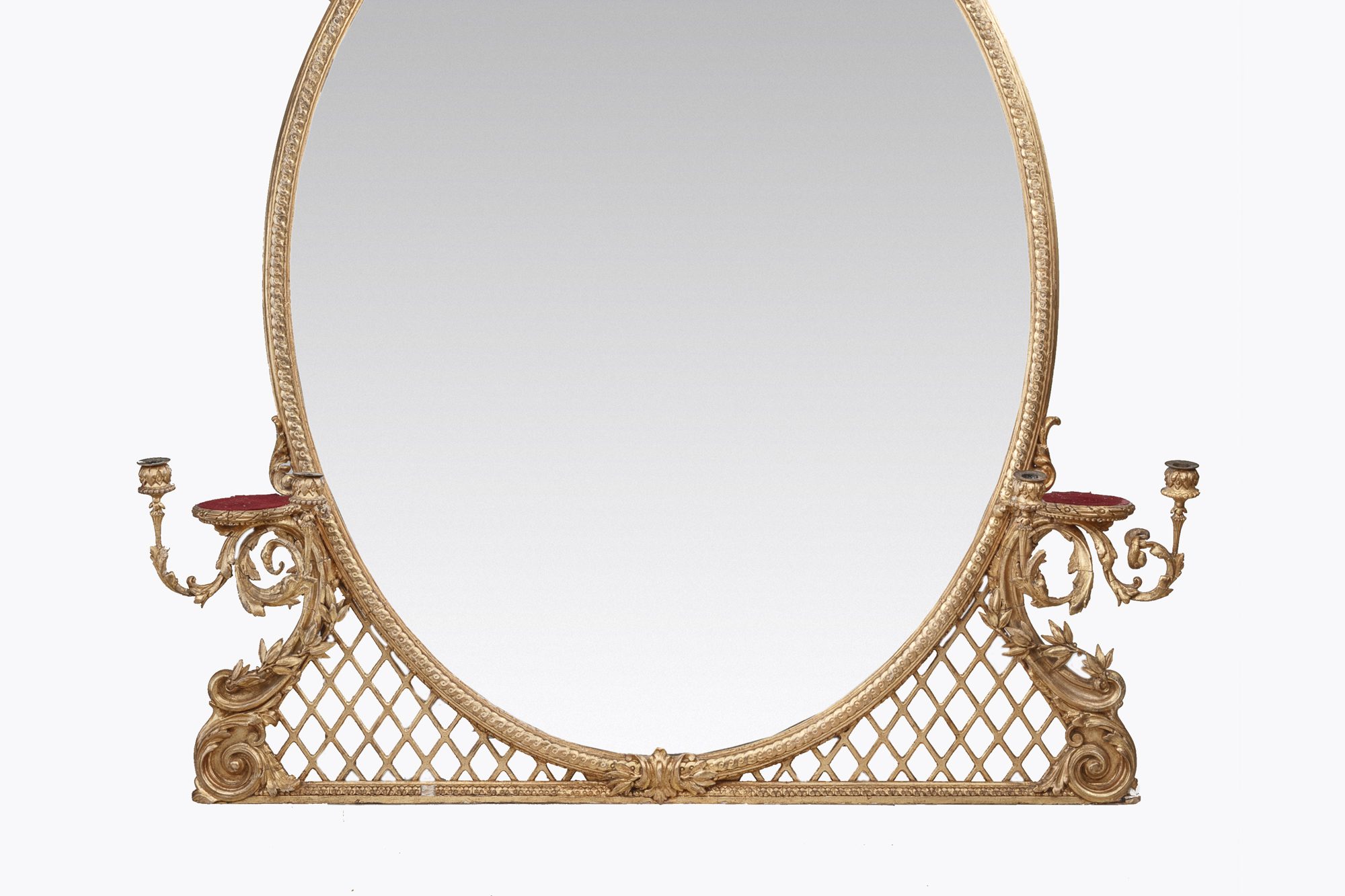 19th century gilt oval overmantle girandole mirror with finely carved frame featuring intricate fretwork to apron and surmounted with a crest featuring a pair of birds and ribbon. Flanked by shelves and two-arm girandole candle holders.