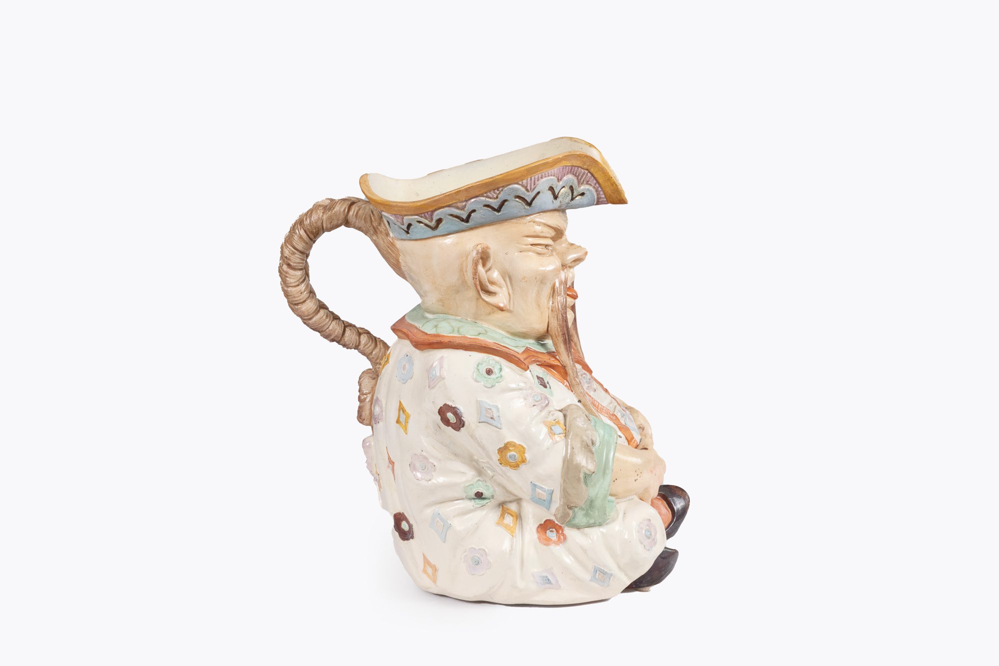 19th Century rare large porcelain Chinoiserie toby jug by Wittman & Roth, London. Depicting a seated Chinese man with a mischievous expression, wearing colourful textured clothing and a shaped hat. His long braid forms the handle to back. Marked ‘W&R L’ to base.