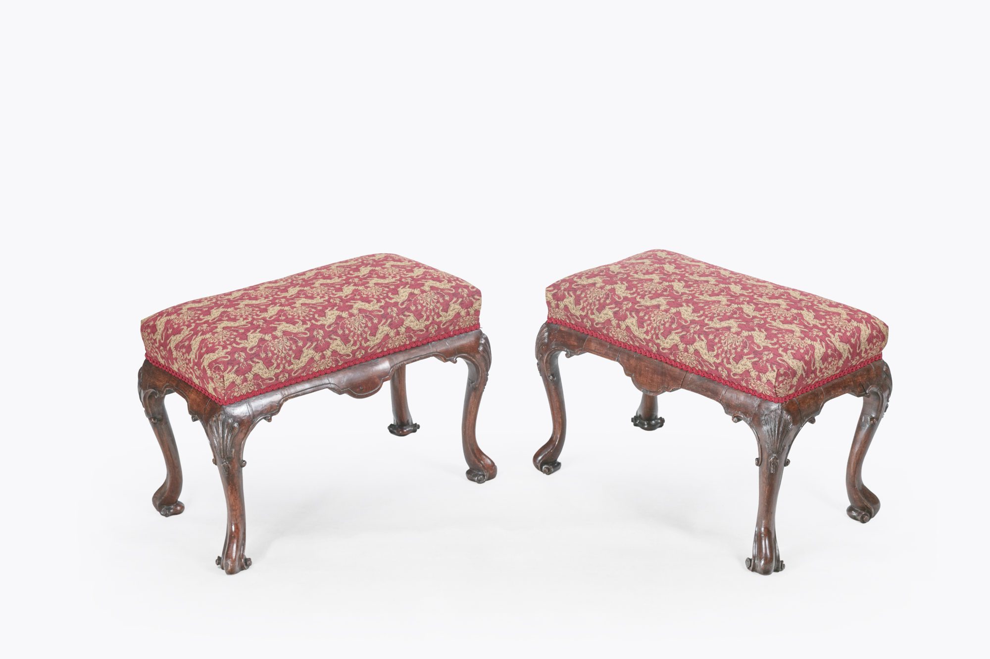 19th Century William IV mahogany stool with a needlepoint stuff-over seat on cabriole legs ending in paw feet, circa 1830.